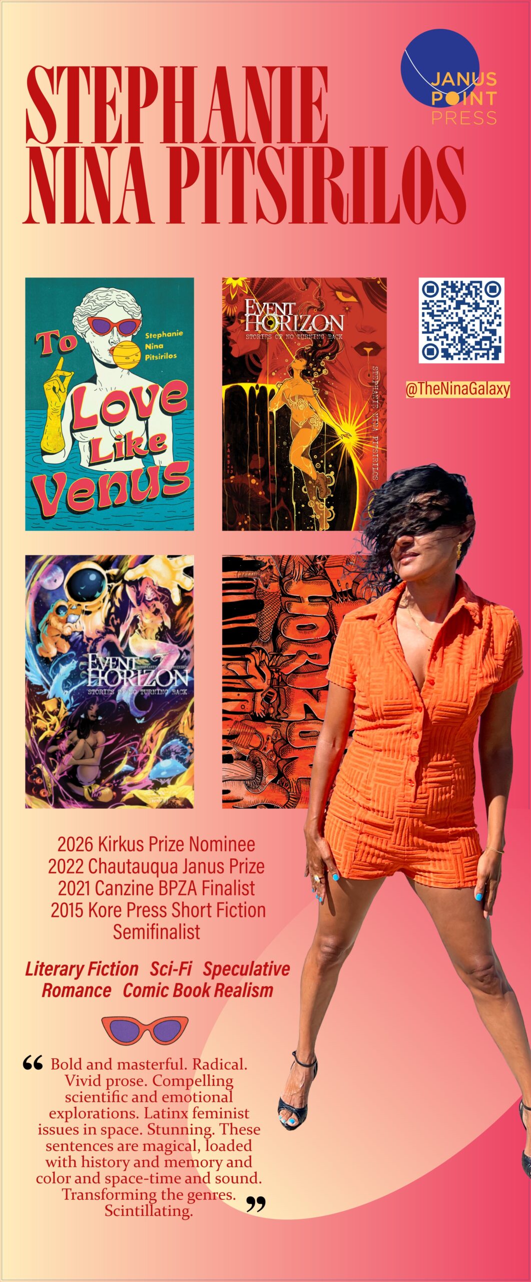 STEPHANIE NINA PITSIRILOS (To Love Like Venus, Event Horizon: Stories of No Turning Back) is a critically acclaimed prose and comics writer. She is the recipient of the 2022 Chautauqua Janus Prize for her story “Jean” and accolades for her work include Kirkus Reviews, Publishers Weekly, Kore Press, Broken Pencil Magazine, and Canzine2021. Featured at the 2021 AWP Conference & Bookfair as a new voice “transforming the genres” of science fiction and fantasy, Professor Latinx noted her work as “revitalizing the short comic form”. To rave reviews she published Event Horizon: Stories of No Turning Back, her genre-bending, multi-medium debut short story collection and multi-artist collaboration (Janus Point Press, 2024) with a stellar preorder campaign on Kickstarter, highlighting her range of collaboration with celebrated artists. Her debut novel To Love Like Venus is a 2026 Kirkus Prize nominee. Her creative mediums are prose, comics, graphic novels, and zines. She’s a Kickstarter superstar, always earning a coveted “Project We Love.”